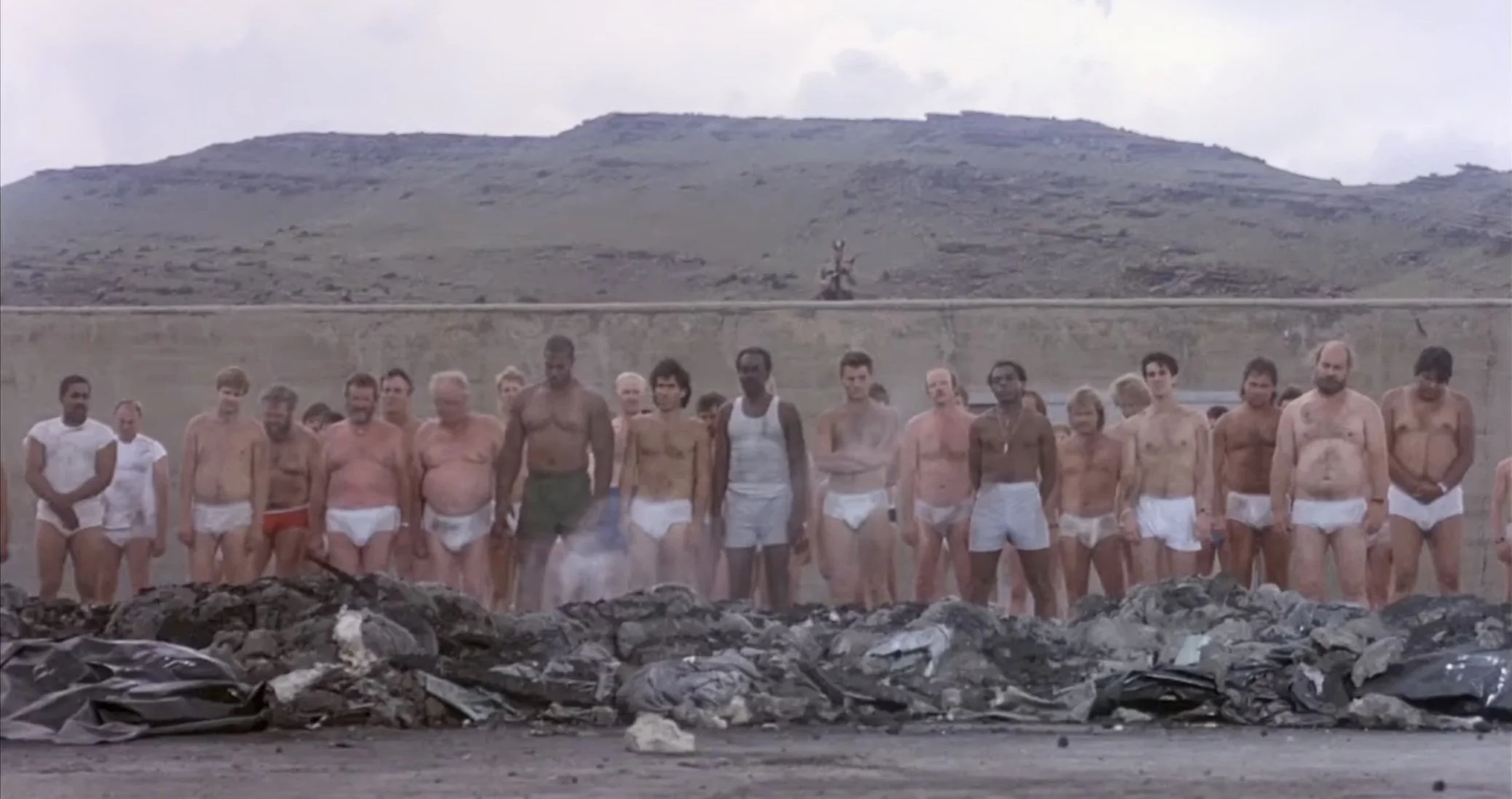 The inmates are taken to the yard. Their mattresses are soaked in gasoline.